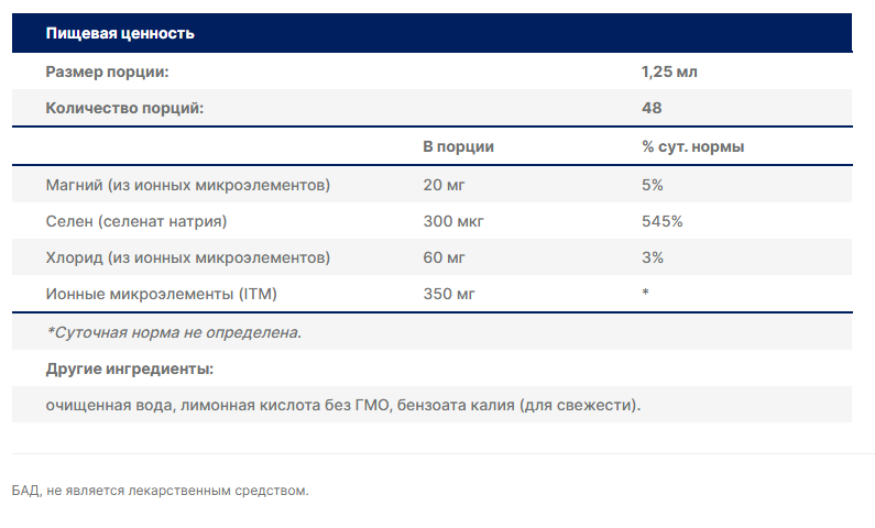 Добавка также содержит магний и хлорид, которые поддерживают нервную систему, способствуют расслаблению мышц и улучшают обмен веществ. Идеально подходит для тех, кто ведёт активный образ жизни, испытывает повышенные физические или умственные нагрузки, живёт в условиях экологического стресса или хочет укрепить свой иммунитет в сезон простуд. Удобная жидкая форма позволяет легко дозировать средство — просто добавьте 1,25 мл в воду или сок один раз в день. Без ГМО, без искусственных красителей и консервантов — только очищенная вода, лимонная кислота и бензоат калия для свежести.