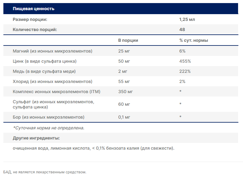 Приятный лимонный вкус и удобная форма — всего 1,25 мл (примерно четверть чайной ложки) в день — делают приём комфортным даже для самых чувствительных. Идеально подходит для взрослых, ведущих активный образ жизни, спортсменов, людей с повышенными потребностями в микроэлементах, а также тем, кто хочет укрепить иммунитет и поддержать здоровье изнутри. Производство соответствует высоким стандартам качества, что гарантирует чистоту и безопасность продукта.