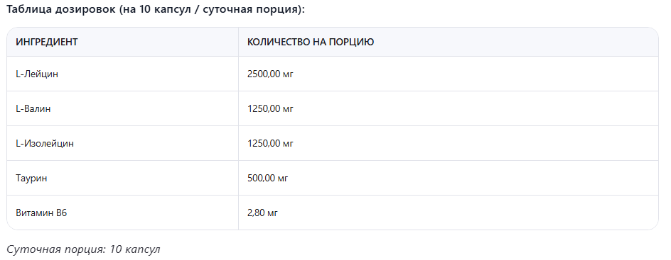 L-Лейцин, L-Валин, L-Изолейцин, Таурин, Витамин B6 (пиридоксин гидрохлорид), оболочка капсулы (желатин, краситель E171).