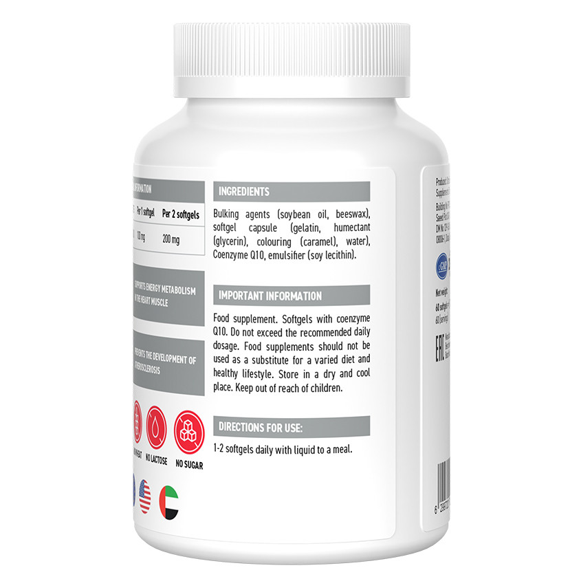 Поддержите здоровье своего сердца и уровень энергии с биологически активной добавкой Ultrasupps CoQ10 Antioxidant 100 мг. Эта высокодозированная формула содержит 100 мг коэнзима Q10 в каждой мягкой капсуле — мощного антиоксиданта, который играет ключевую роль в выработке клеточной энергии и защите клеток от окислительного стресса. Коэнзим Q10 особенно важен для работы сердечной мышцы, обеспечивая её постоянную энергией и поддерживая нормальный метаболизм. Регулярный приём этой добавки помогает предотвращать развитие атеросклероза, улучшая состояние сосудов и способствуя здоровому кровообращению. Идеально подходит для людей, ведущих активный образ жизни, пожилых людей или тех, кто испытывает повышенные физические или эмоциональные нагрузки. Благодаря своей высокой биодоступности, CoQ10 в форме мягких капсул легко усваивается организмом. Продукт не содержит глютен, пшеницу, лактозу и сахар, что делает его подходящим для широкого круга потребителей, включая тех, кто придерживается специальных диет. Производство осуществляется с соблюдением международных стандартов качества, что гарантирует чистоту и эффективность каждой капсулы. Поддержите свою жизненную энергию и здоровье сердца — выберите Ultrasupps CoQ10 Antioxidant.