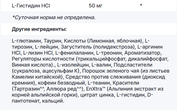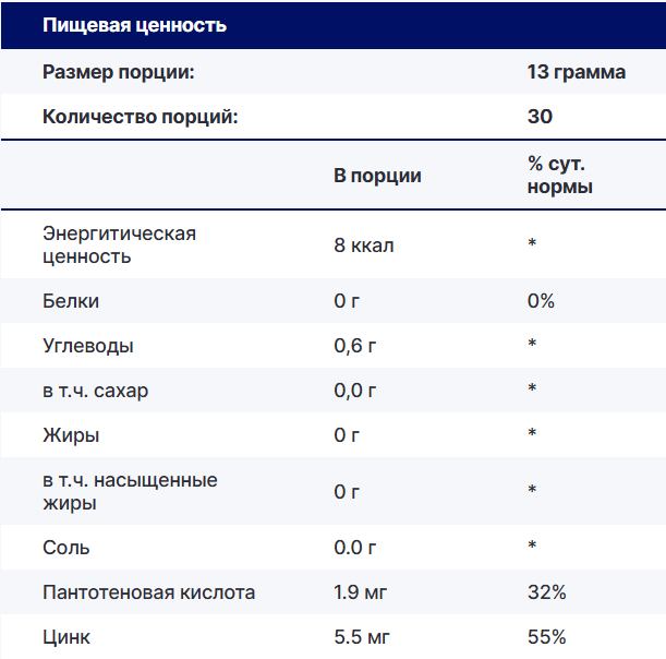 Дополнительные компоненты: Экстракт зеленого чая способствует жиросжиганию, а пантотеновая кислота (витамин B5) и цинк играют важную роль в энергетическом обмене.