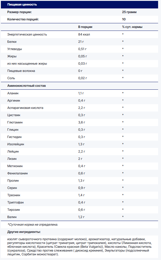 - 21 г чистого белка на порцию с минимальным количеством жиров (0,05 г) и углеводов (0,51 г).