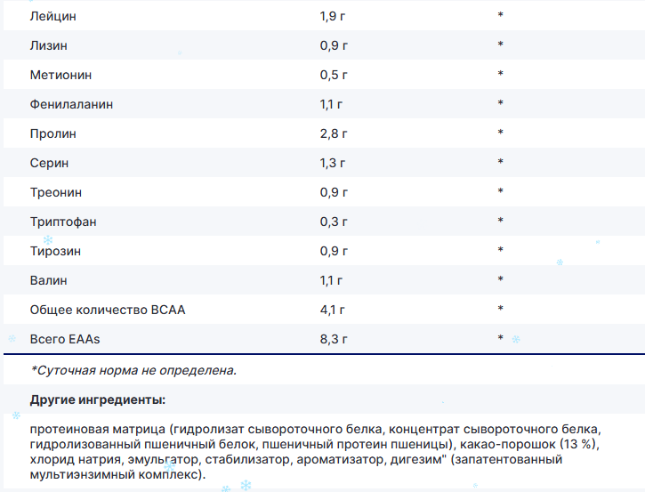 Каждая порция (30 г) содержит 20 г чистого белка — идеальный объем для стимуляции синтеза мышечных белков. Благодаря уникальной смеси гидролизата и концентрата сывороточного белка, а также пшеничного белка, ваш организм получает мгновенный и продолжительный приток аминокислот. Особенно ценен высокий уровень BCAA (4,1 г) и незаменимых аминокислот EAA (8,3 г), которые напрямую участвуют в построении мышц и предотвращают катаболизм. Глютамин (7,5 г) в составе усиливает восстановление, укрепляет иммунитет и снижает мышечную усталость.