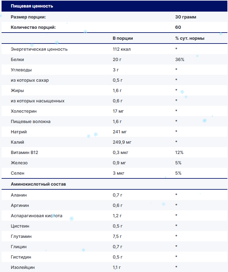Белок обогащен витамином B12, железом и селеном — ключевыми микроэлементами для энергетического обмена, кроветворения и антиоксидантной защиты. Низкое содержание жиров (1,6 г) и углеводов (3 г) делает его идеальным для сухого набора массы и поддержания рельефа.