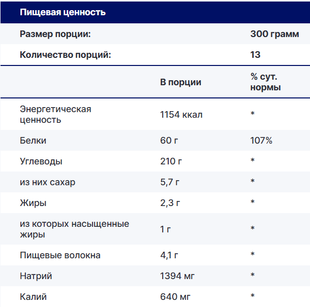 Высокая калорийность: Одна порция (300 г) содержит 1154 ккал, что создает мощный энергетический избыток, необходимый для роста мышц.