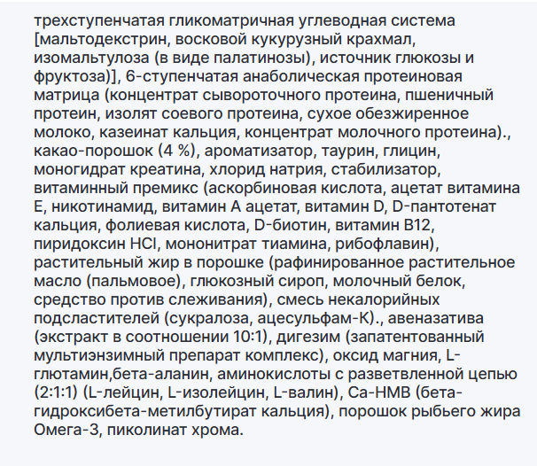 Углеводная система (208 г на порцию): Трехступенчатая матрица из разных источников углеводов(мальтодекстрин, восковой кукурузный крахмал, изомальтулоза (в виде палатинозы)) обеспечивает как быстрое, так и продолжительное высвобождение энергии для тренировок и восстановления.