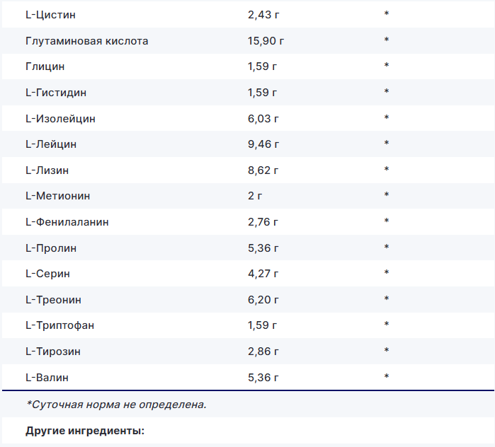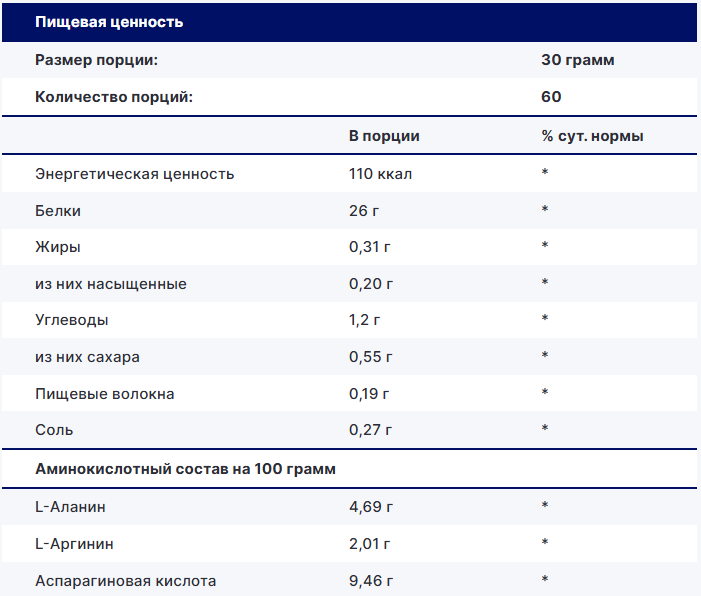 Комплекс аминокислот: Содержит полный профиль незаменимых (EAA) и аминокислот с разветвленной цепью (BCAA), которые критически важны для синтеза белка, повышения силы и выносливости.