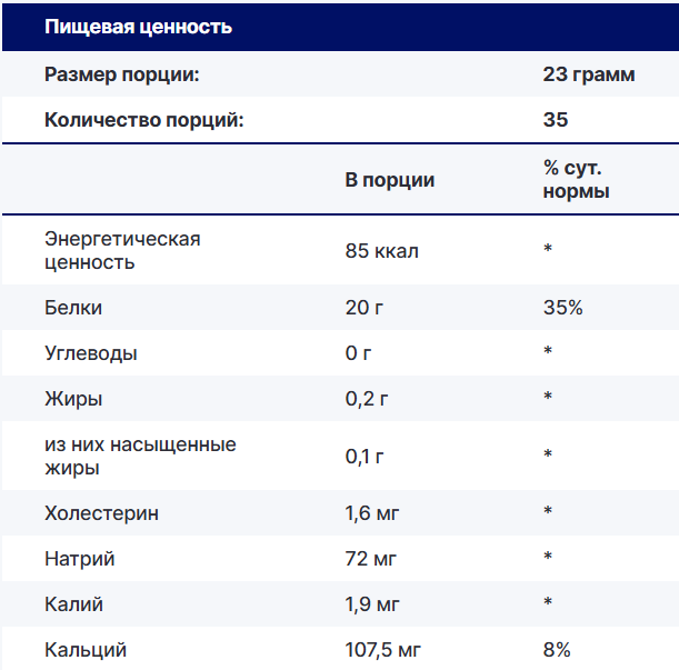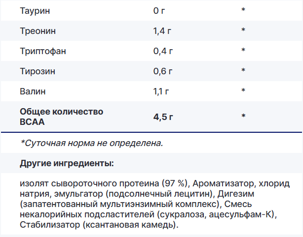 • Чистейший белок: основной ингридиент — изолят сывороточного протеина, один из самых быстроусвояемых и эффективных видов белка для роста и восстановления мышц.