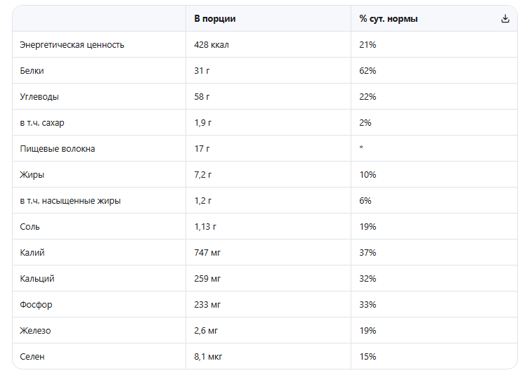 Каждая порция (125 г) дарит вам 428 ккал чистой энергии, 31 г высококачественного белка и 58 г сложных углеводов — идеальное соотношение для набора мышечной массы без лишнего жира. Благодаря содержанию пищевых волокон (17 г!) продукт поддерживает здоровье ЖКТ и обеспечивает длительное чувство сытости. Богатый минеральный профиль (калий, кальций, фосфор, железо, селен) способствует укреплению костей, нормализации работы нервной системы и повышению общей выносливости.