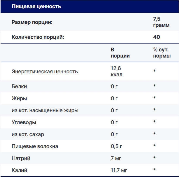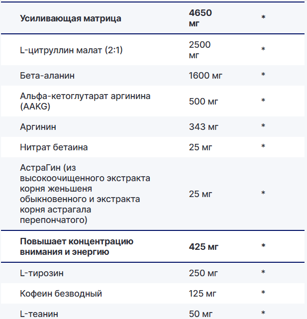 *Для оценки переносимости начните с половины мерной ложки. Не используйте продукт ежедневно в течение длительного времени во избежание толерантности к компонентам. Из-за содержания кофеина не принимайте добавку во второй половине дня, если это может нарушить ваш сон.